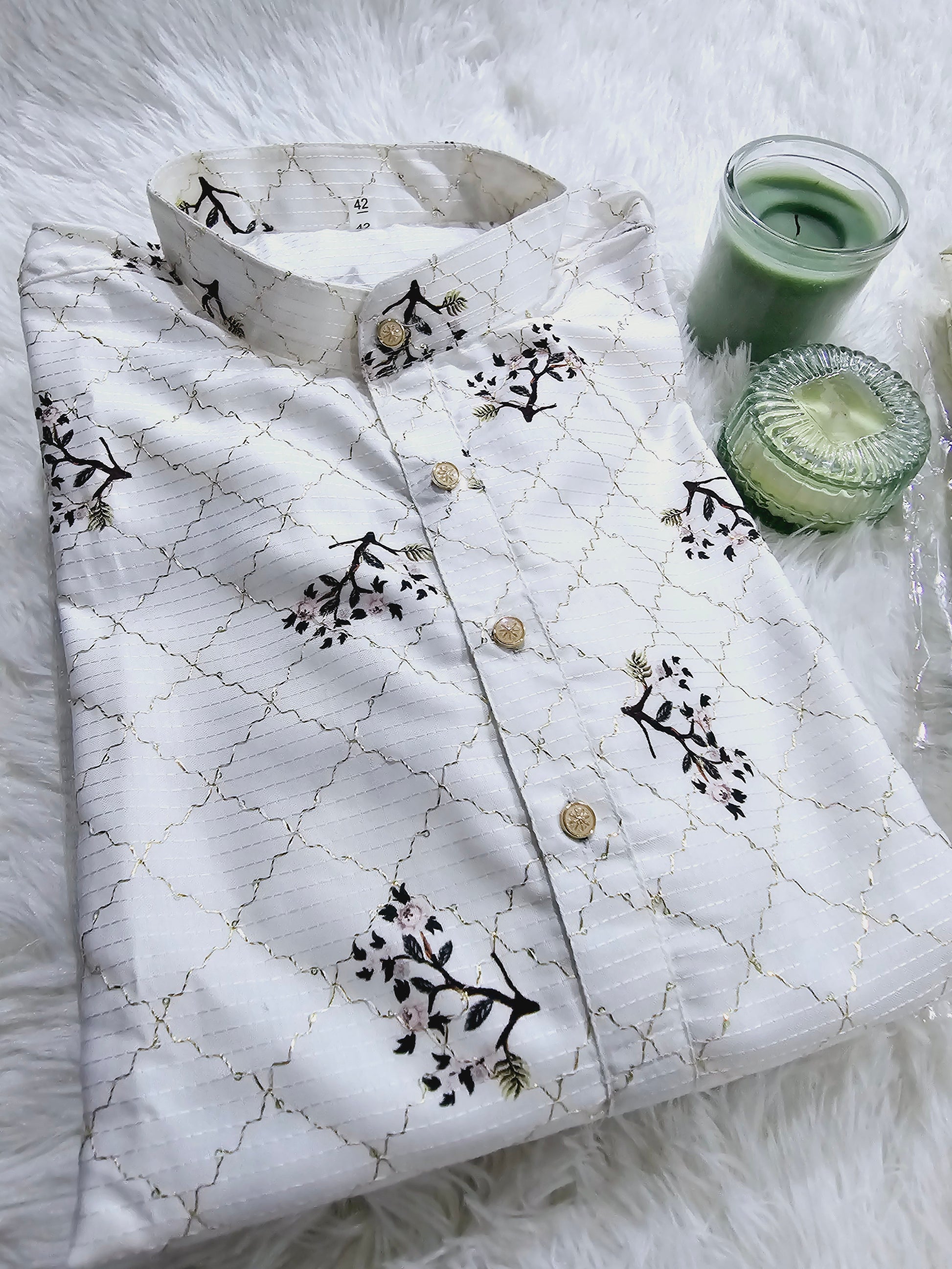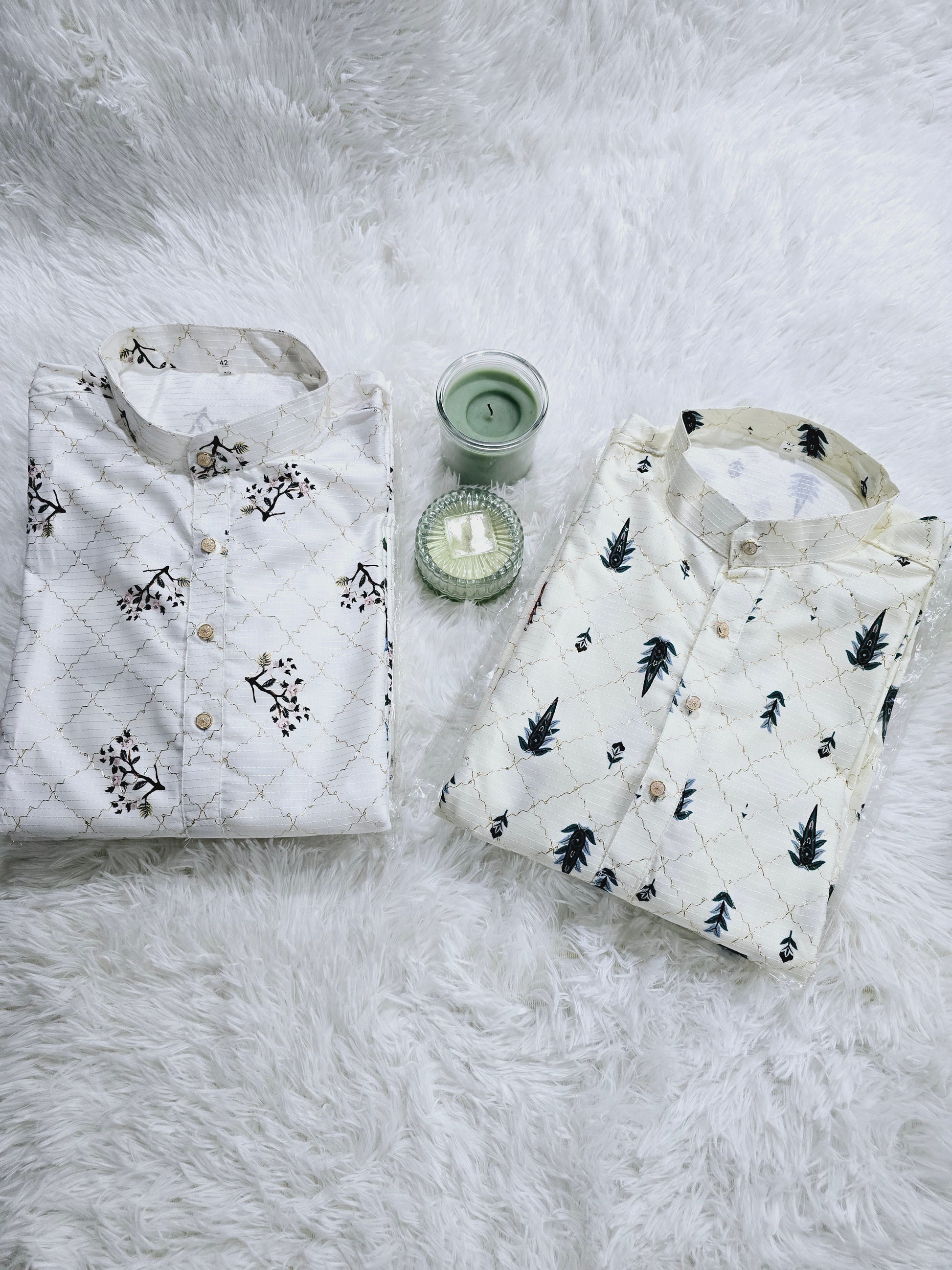 Men kurta with crochet sequins and digital prints, vibrant designer ethnic kurta.
